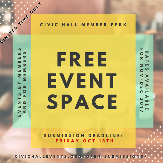 For a limited time, Civic Hall is offering members FREE space for member-focused events. Space is filling up fast, so if you or your organization would like to host an event in November - December, please fill out the submission formby Friday, October 13th.